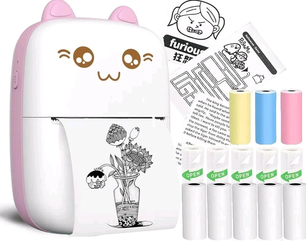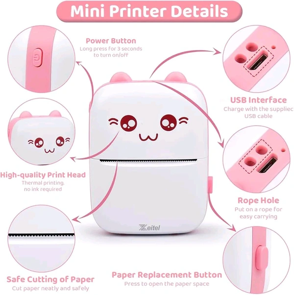 Mini Bluetooth Thermal Printer, Portable Label Printer Inkfree Printer for Android & iOS System, Black on White Thermal Printer with 10 Roll of Print Paper, Stickers, Pink